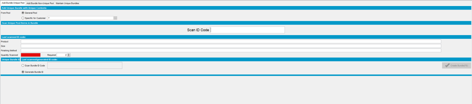Unique Bundles is a feature that enables the creation of grouped products identified by a unique barcode. Each bundle represents a defined quantity of items, such as a stack of sheets from the ironer, which is labeled and tracked as a single unit within the system.